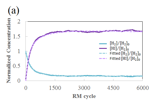 そこで先ずは、高校化学においてもよく知られる二次の可逆反応系(H2+I2⇋2HI)を対象に、RMシミュレーションを行った。その結果、図3(a)のようにRMサイクルに対するH2分子とHI分子の濃度変化が得られた。本結果から得られたあるRMサイクルkにおける各成分濃度[H2]k, [I2]k及び[HI]kと、対象系の正反応と逆反応の速度定数kfとkbを用いて、反応速度式から導いた次式によって、あるRMサイクルNまでの経過時間tが算出できる。